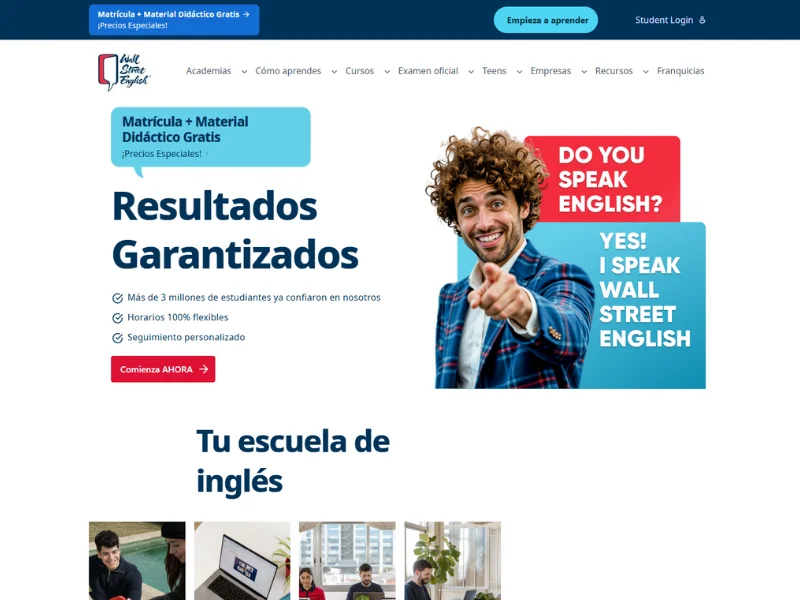 La propuesta de Wall Street English se basa en un método exclusivo e hibrido que combina clases presenciales con aprendizaje digital interactivo. De esta forma, se adapta al ritmo y necesidades de cada alumno con tecnología avanzada, interacción personalizada y seguimiento continuo.
